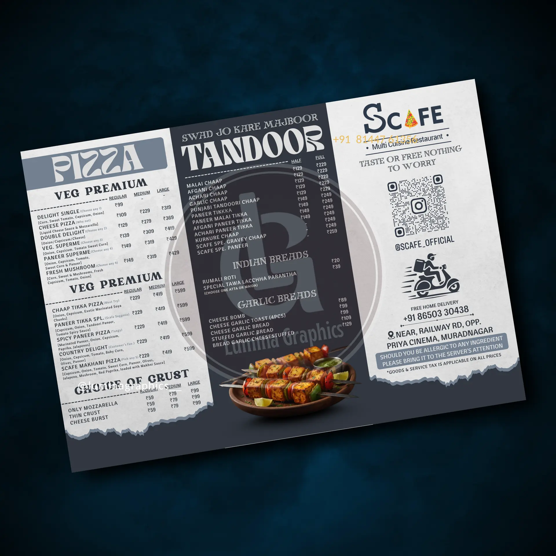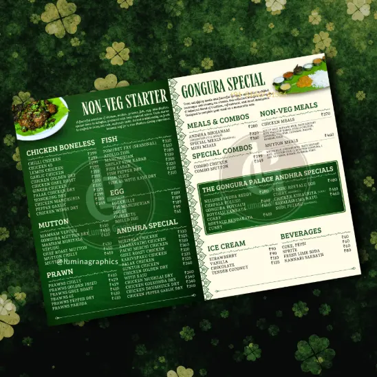 Each project featured below is an original design created by Lumina Graphics with attention to layout, hierarchy, print precision & based on the restaurant need & theme for modern restaurant branding.