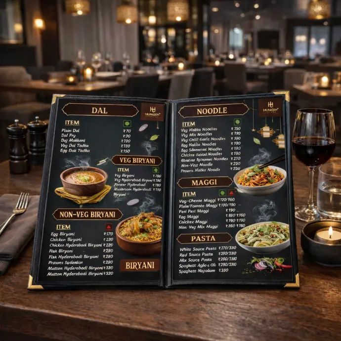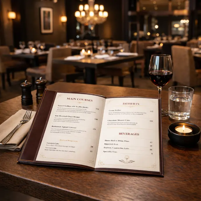 Professional menu design solutions structured to match your restaurant’s scale and requirements, from single-page menus to full multi-page booklets.